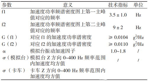 模擬運(yùn)輸臺(tái)的設(shè)計(jì)參數(shù)主要依據(jù)《QJ/T 815.2-94產(chǎn)品公路運(yùn)輸加速模擬試驗(yàn)方法》[3]設(shè)定。該標(biāo)準(zhǔn)中規(guī)定了模擬運(yùn)輸臺(tái)的關(guān)鍵技術(shù)指標(biāo),見表1。